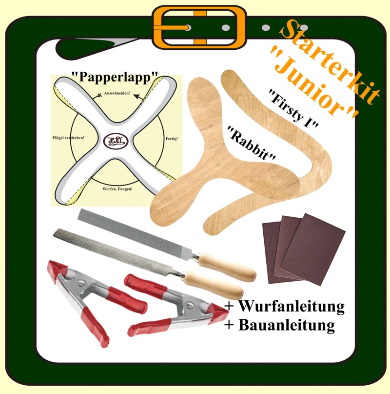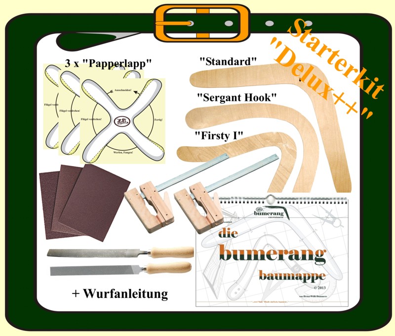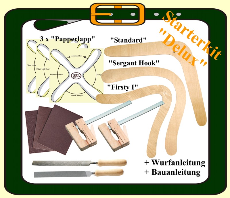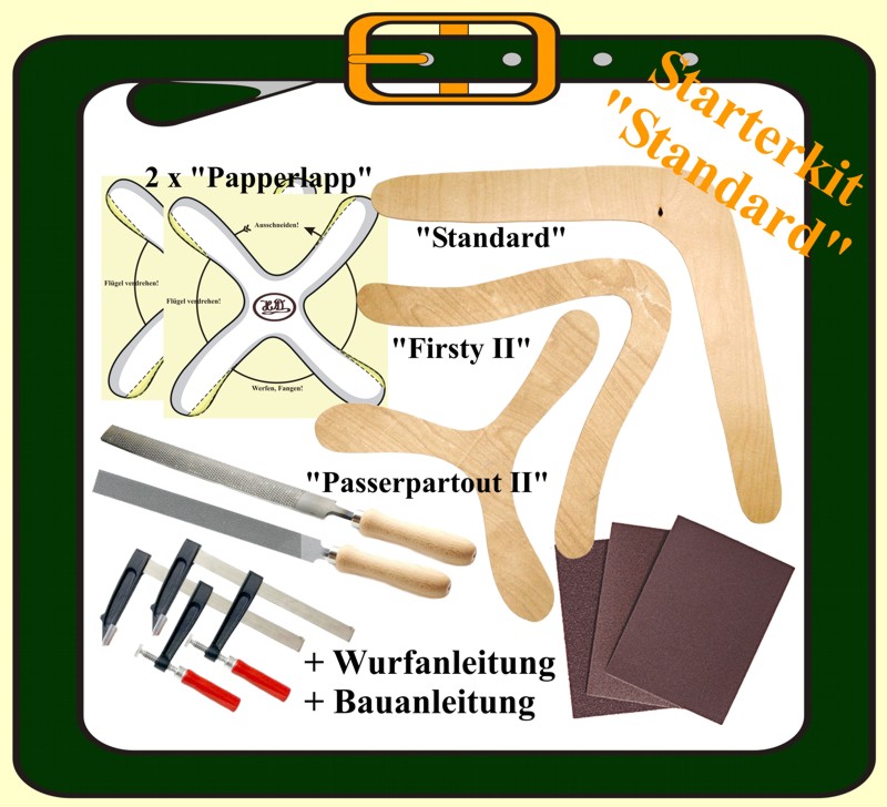 Here you can get starter packs in different versions. A starter kit is a collection of tools and materials that you need, if you want to build boomerangs. |
